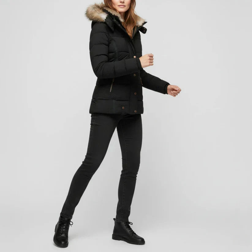 Aurora – warme, gefütterte winterjacke mit fellkapuze und reißverschlusstaschen