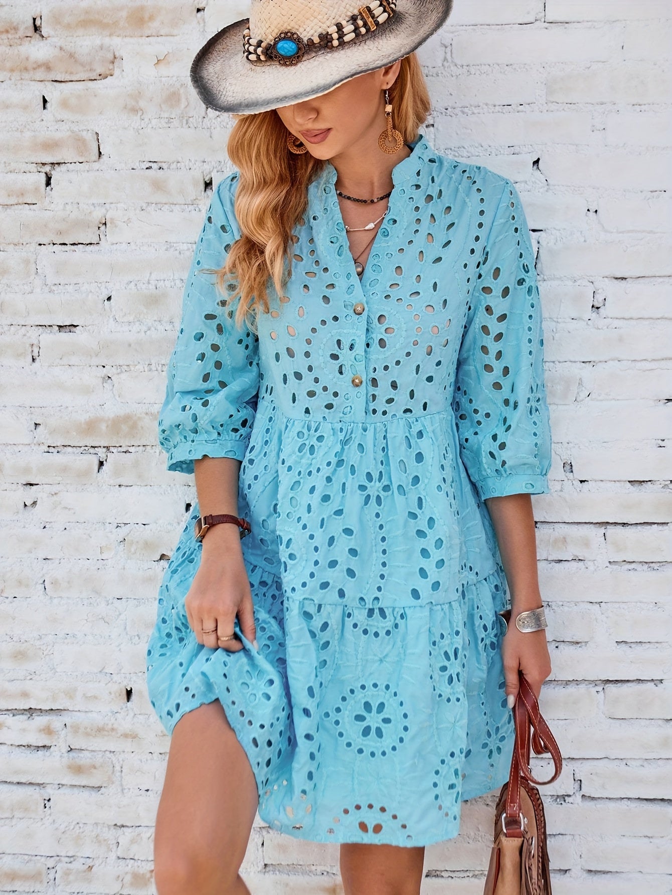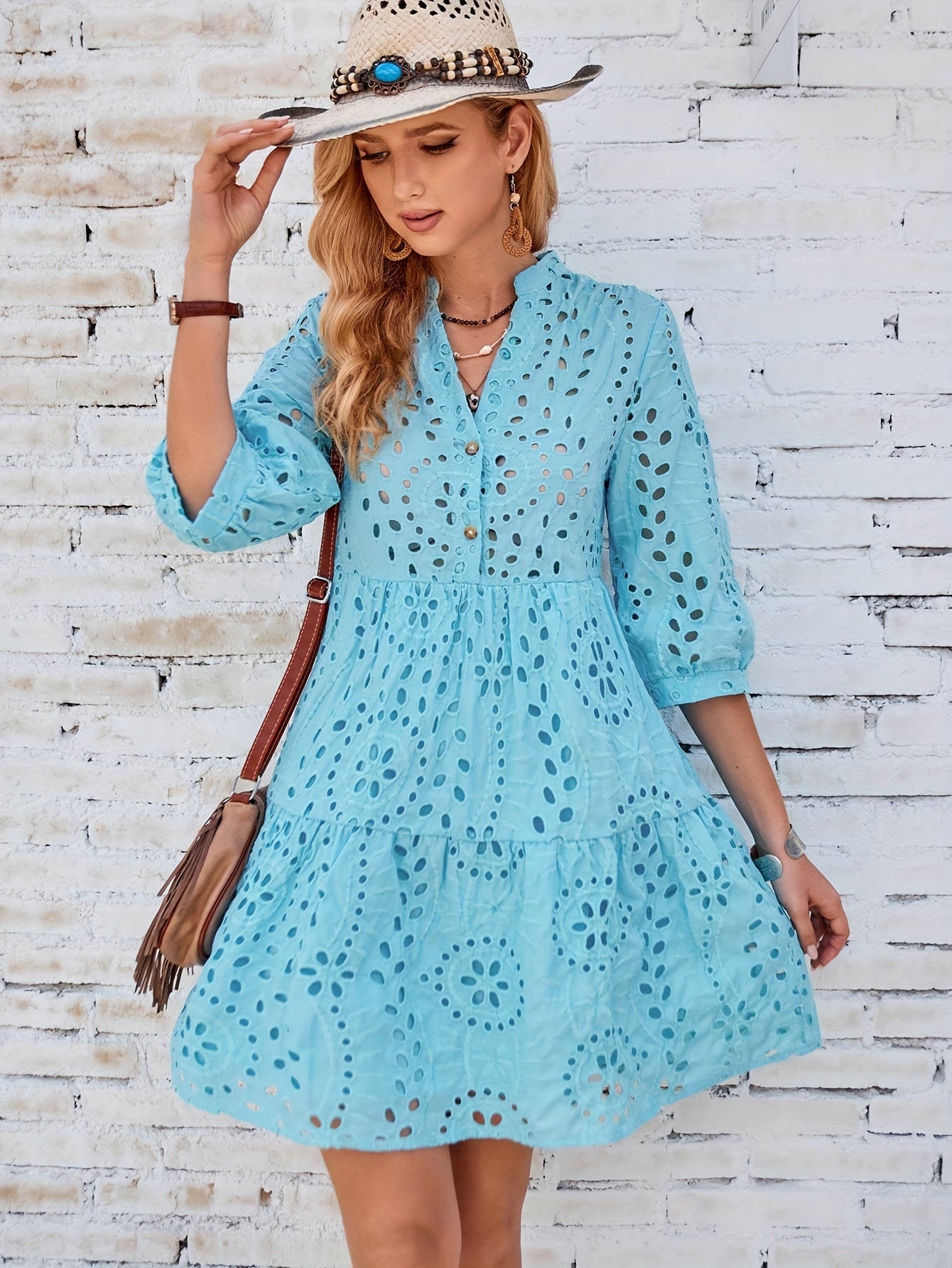 Perfekt kombinierbar mit Sandalen und dezentem Schmuck, bietet dieses Lochstickerei-Kleid vielseitige Styling-Möglichkeiten. Ob für einen Spaziergang am Strand, eine Sommerparty oder einen entspannten Tag in der Stadt, es passt sich jeder Gelegenheit an und lässt Sie immer modisch und selbstbewusst auftreten.