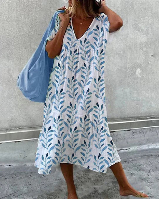 Boho - blätterdruck midi-kleid mit fliebendem schnitt