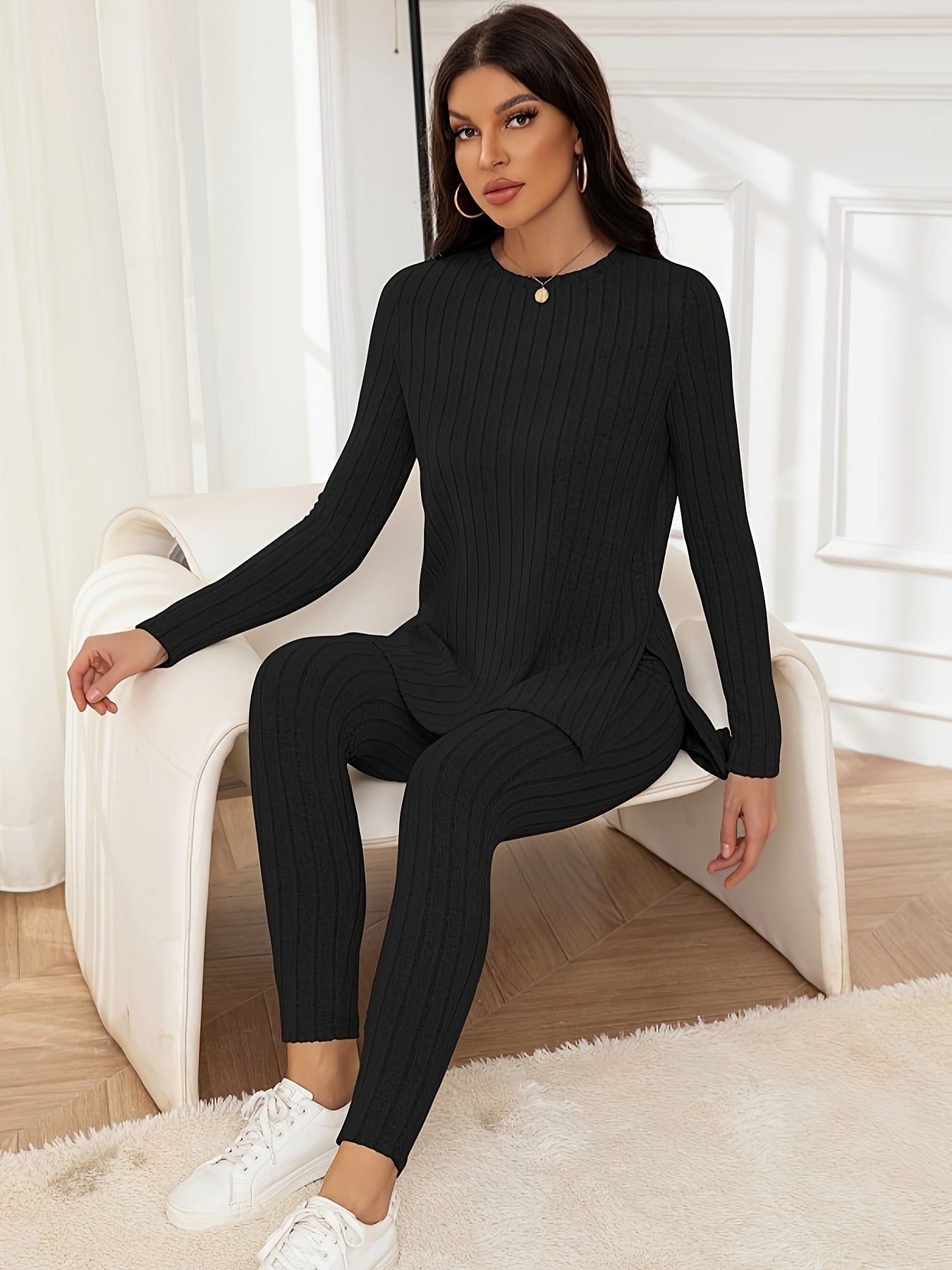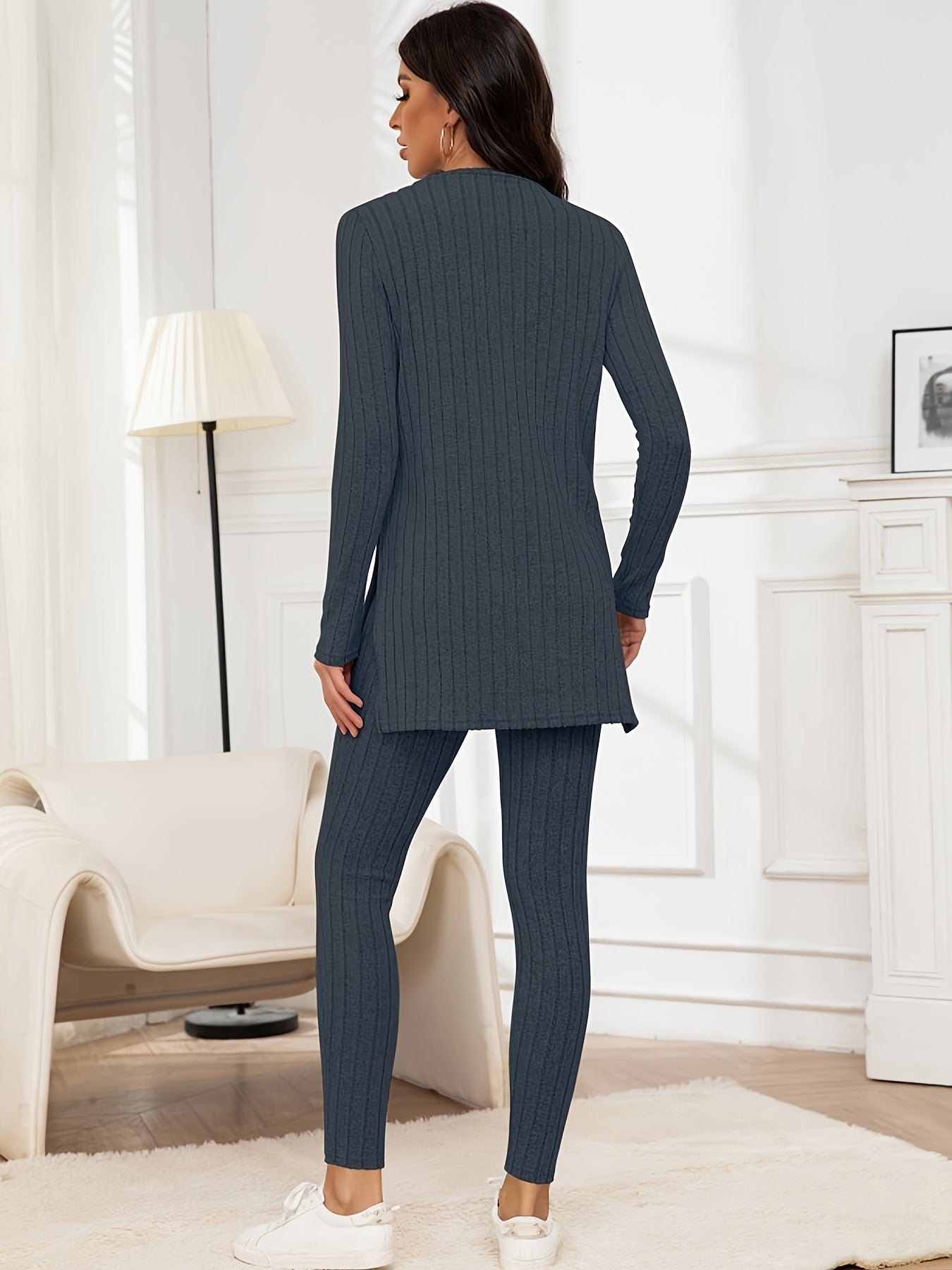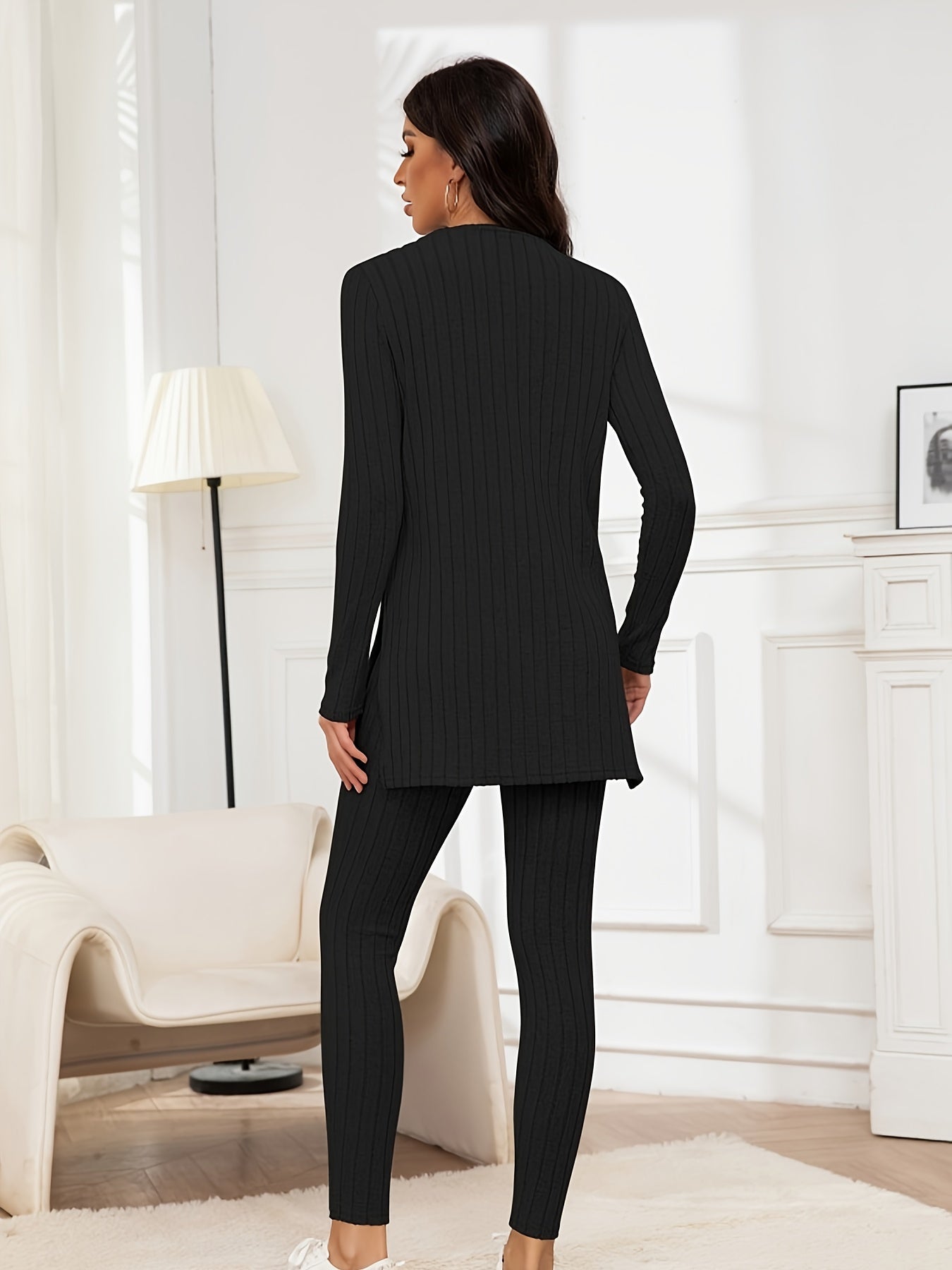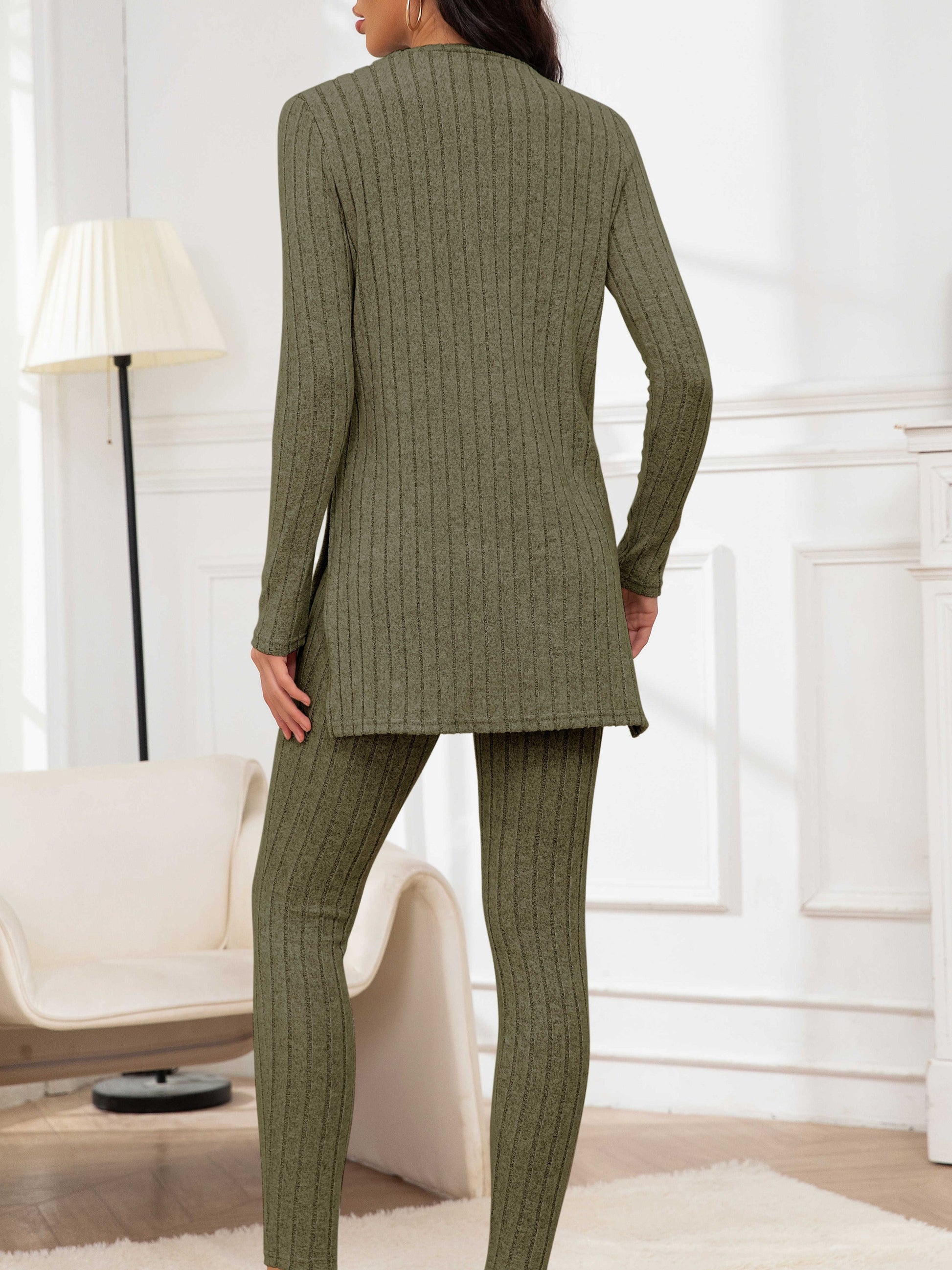 Der elegante Schnitt des Oberteils mit seitlichen Schlitzen ermöglicht eine optimale Bewegungsfreiheit. Kombiniert mit der figurbetonten Hose ist dieses Set sowohl für entspannte Tage zu Hause als auch für stilvolle Freizeitaktivitäten geeignet.