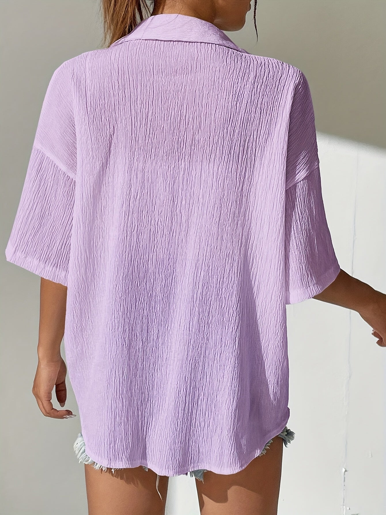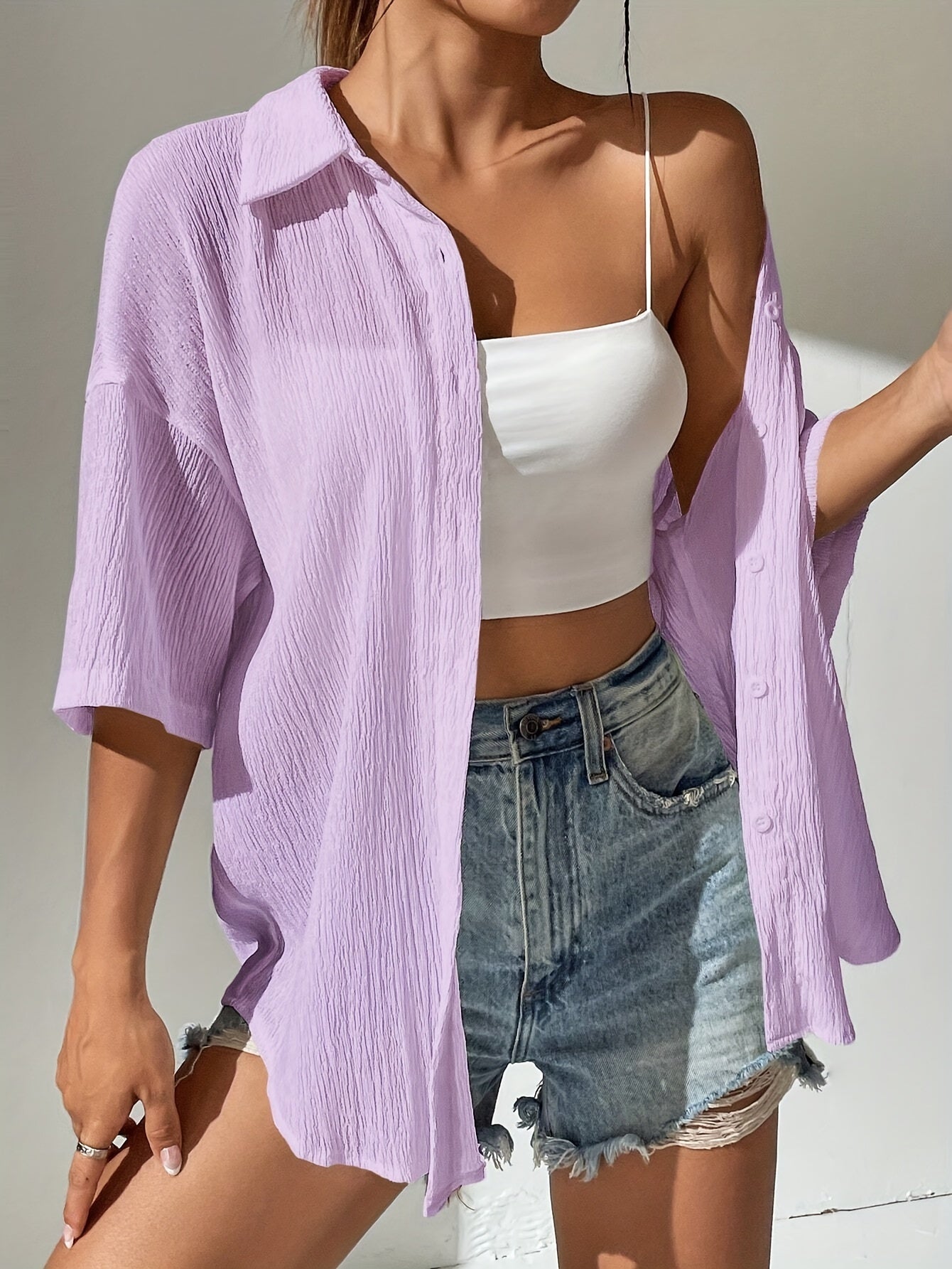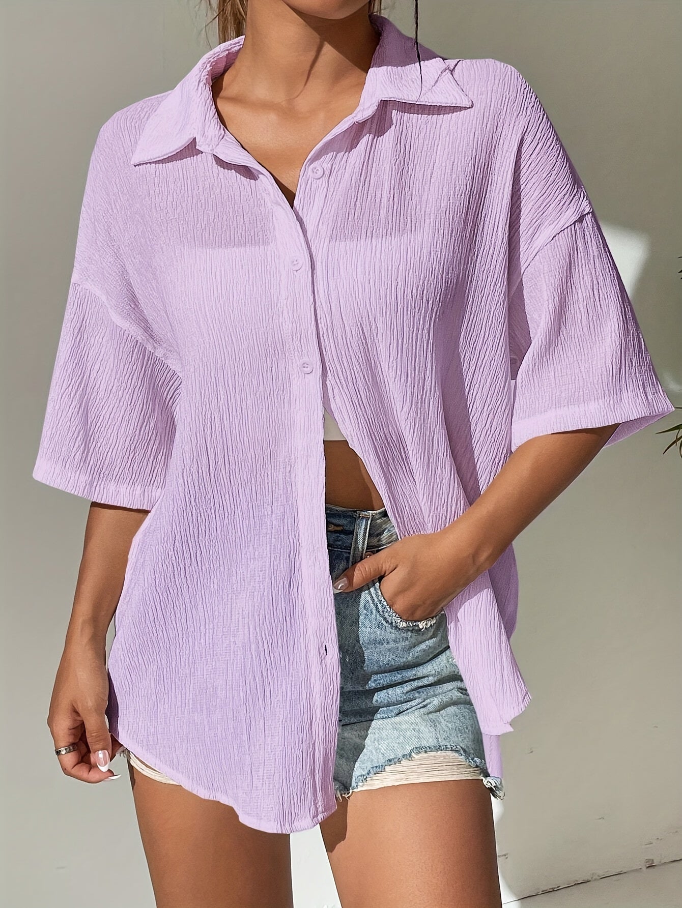 Setzen Sie ein modisches Statement mit diesem vielseitigen Oversized-Hemd. Das schlichte fliederfarbene Design und die hochwertigen Materialien machen es zu einem idealen Begleiter für verschiedenste Anlässe. Ob zu Jeans, Röcken oder Shorts – dieses Hemd ist immer eine stilvolle Wahl.