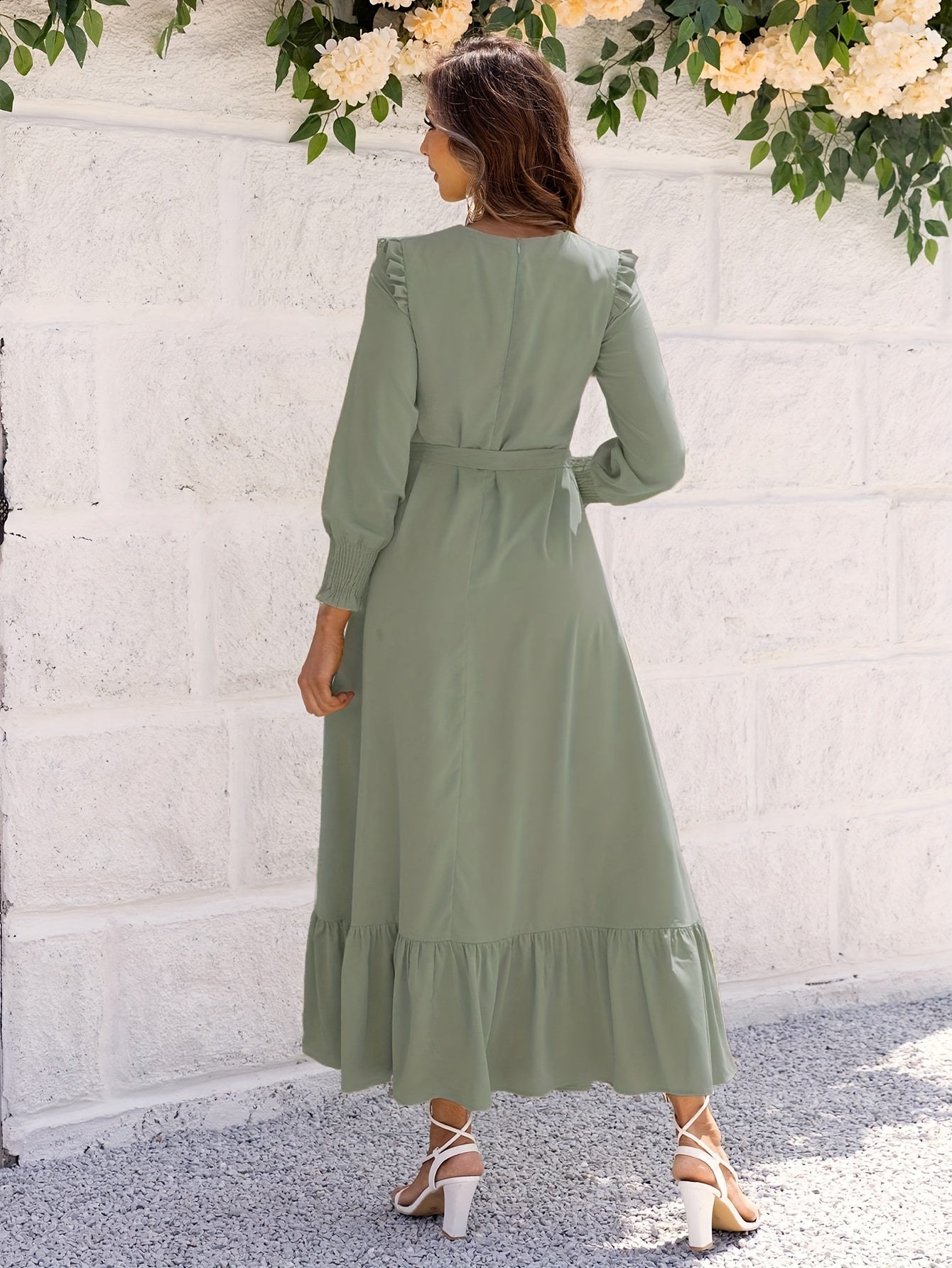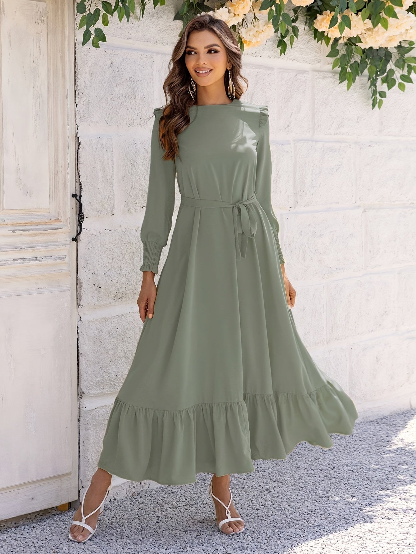 Erleben Sie die elegante Schlichtheit und den Komfort unseres grünen Maxikleids mit Bindegürtel. Dieses Kleid ist ideal für Frauen, die einen zeitlosen und dennoch stilvollen Look bevorzugen.