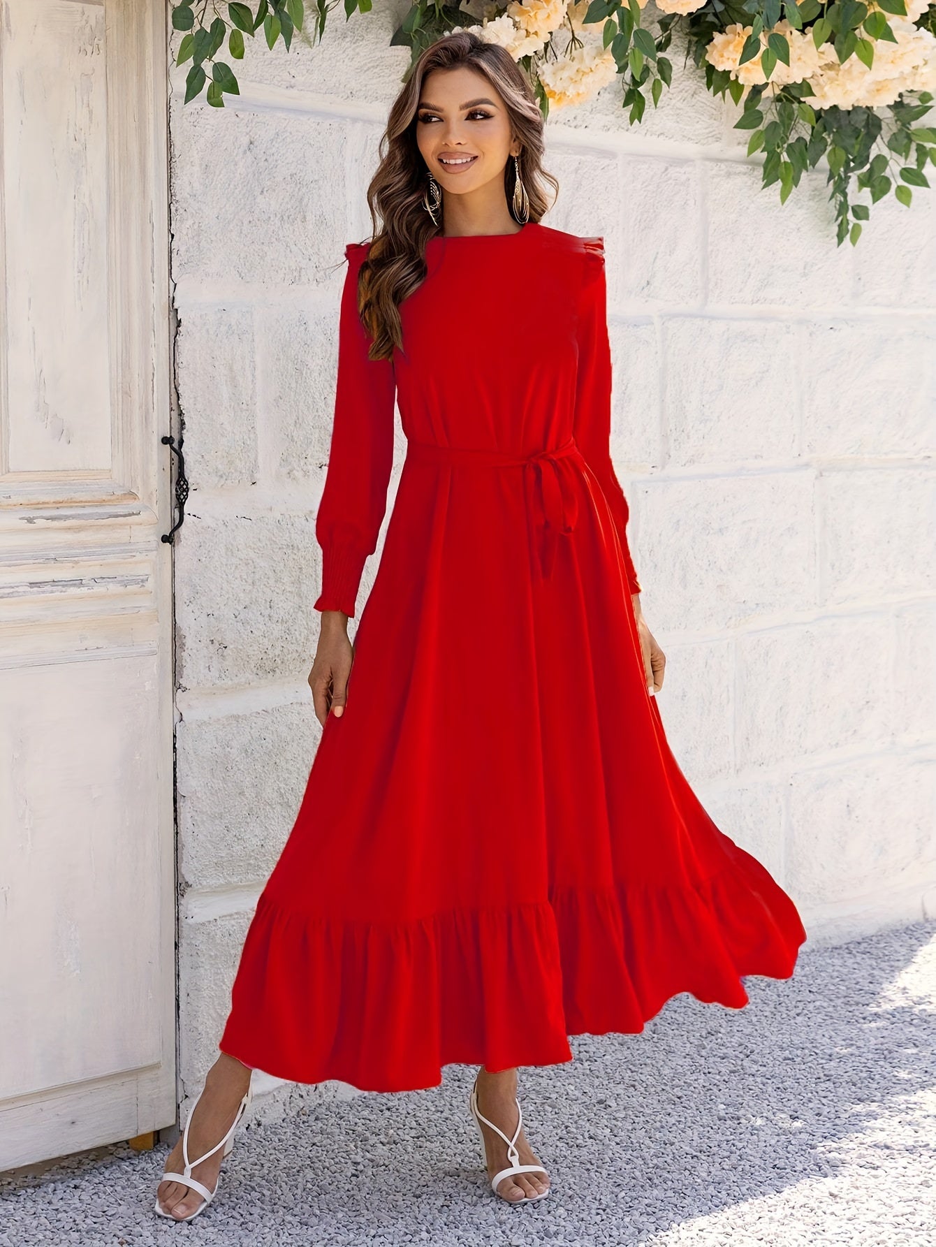 Genießen Sie die Weichheit des fließenden Stoffes, der sich angenehm auf der Haut anfühlt und Ihnen den ganzen Tag über Wohlgefühl bietet. Der Bindegürtel betont Ihre Taille und verleiht dem Kleid eine feminine Silhouette, während die langen Ärmel und der Volantsaum für eine besondere Note sorgen.