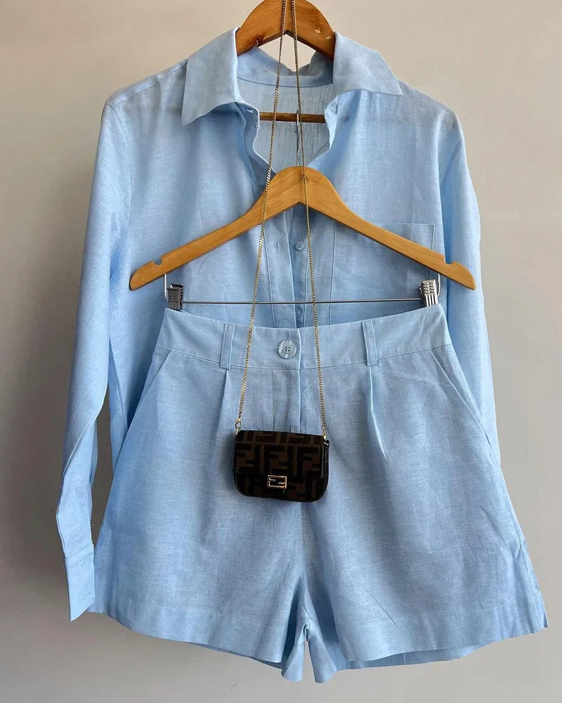 Erfrische deinen Sommerstil mit unserem hellblauen Set mit Hemd und Shorts. Dieses Set kombiniert elegantes Design mit praktischen Details und ist perfekt für warme Tage und lässige Anlässe.
