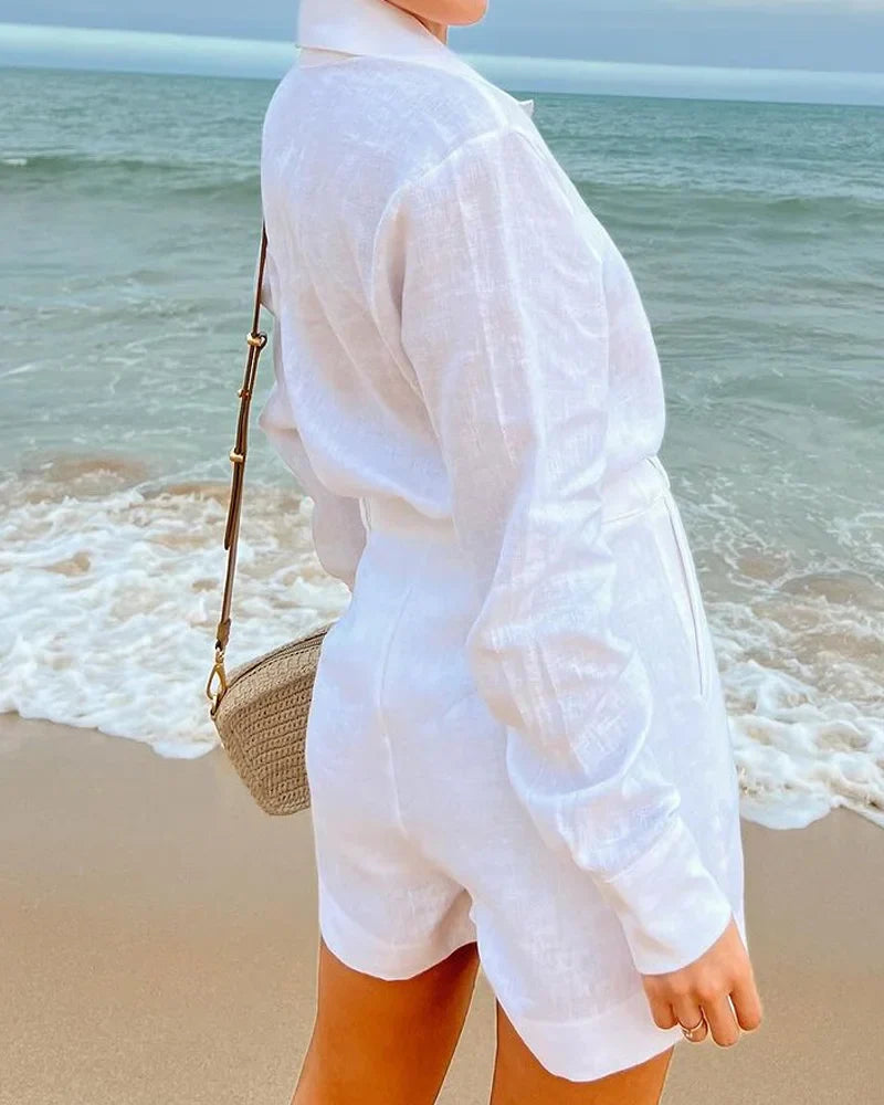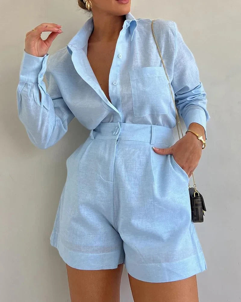 Genieße die Leichtigkeit und den Komfort dieses Sets. Der weiche Stoff und die entspannte Passform sorgen für ein angenehmes Tragegefühl, während das Hemd mit Brusttasche und die hoch taillierten Shorts deinem Look eine moderne Note verleihen.