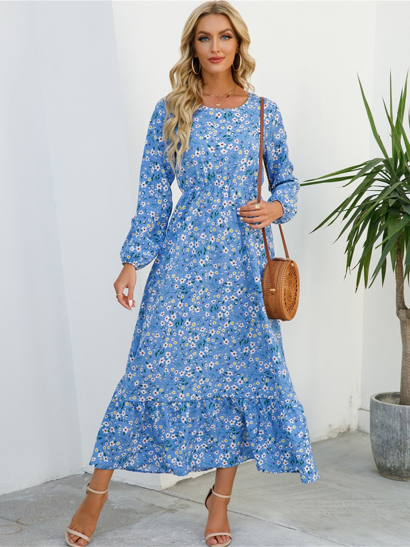 Genießen Sie die Weichheit des fließenden Stoffes, der sich angenehm auf der Haut anfühlt und Ihnen den ganzen Tag über Wohlgefühl bietet. Die zarten Blumenmuster, die gesmokte Taille und die Volants am Saum verleihen dem Kleid eine charmante Note.