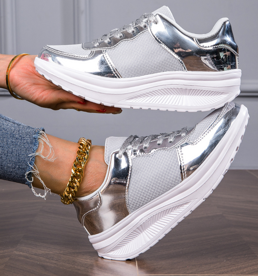 Erleben Sie futuristischen Stil und Komfort mit diesen silbernen Plateau-Sneakern. Das glänzende Design und die auffällige Höhe machen diese Sneaker zu einem absoluten Highlight in Ihrer Schuhkollektion.