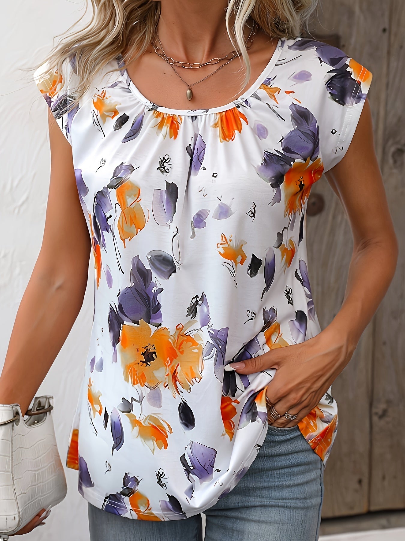 Auffälliges Design: Das auffällige Blumenmuster auf weißem Hintergrund macht diese Bluse zu einem echten Blickfang. Die Farben Orange und Lila sind sorgfältig ausgewählt, um eine warme und einladende Atmosphäre zu schaffen, die sowohl tagsüber als auch abends funktioniert.