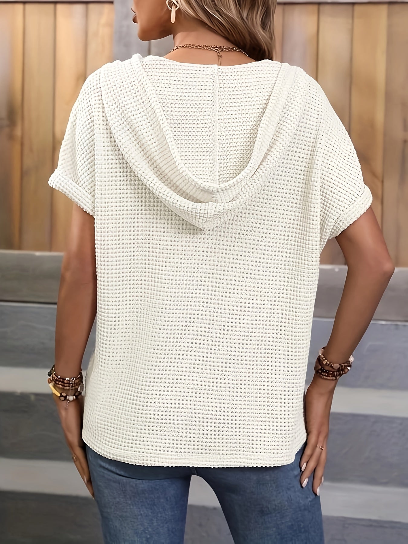 Modernes Design: Das T-Shirt besticht durch seine Waffelstruktur und die lockere Passform. Die Kapuze und die dekorativen Knöpfe sorgen für einen lässigen und dennoch eleganten Stil, der zu vielen Outfits passt.