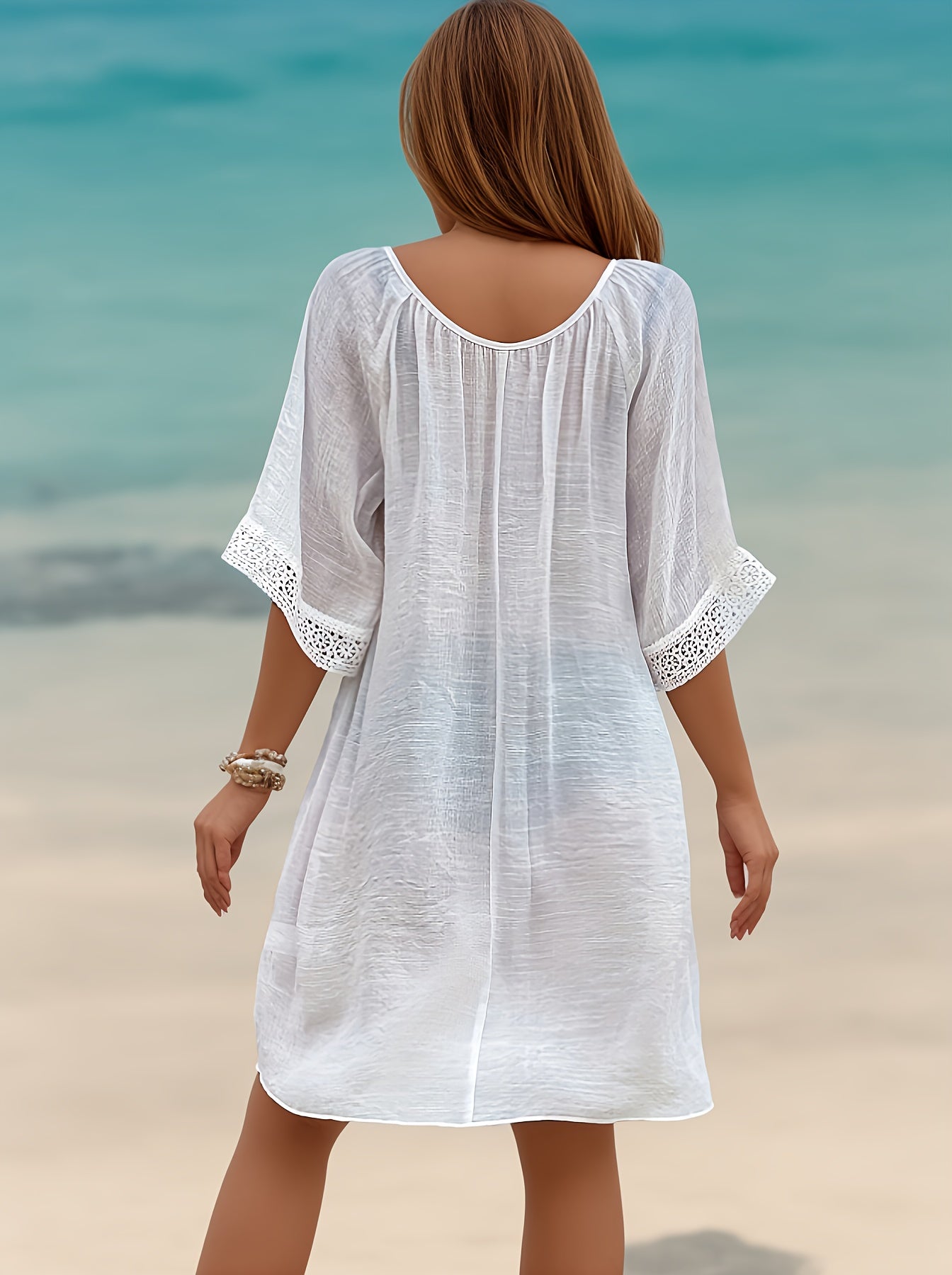 Genießen Sie die hochwertige Verarbeitung und den angenehmen Tragekomfort dieses Strandkleides. Der lockere Schnitt und die halblangen Ärmel sorgen für Bewegungsfreiheit und Leichtigkeit. Das Bindeband am Dekolleté ermöglicht es Ihnen, den Ausschnitt individuell anzupassen, während die Spitzeneinsätze einen zusätzlichen Hauch von Eleganz hinzufügen.