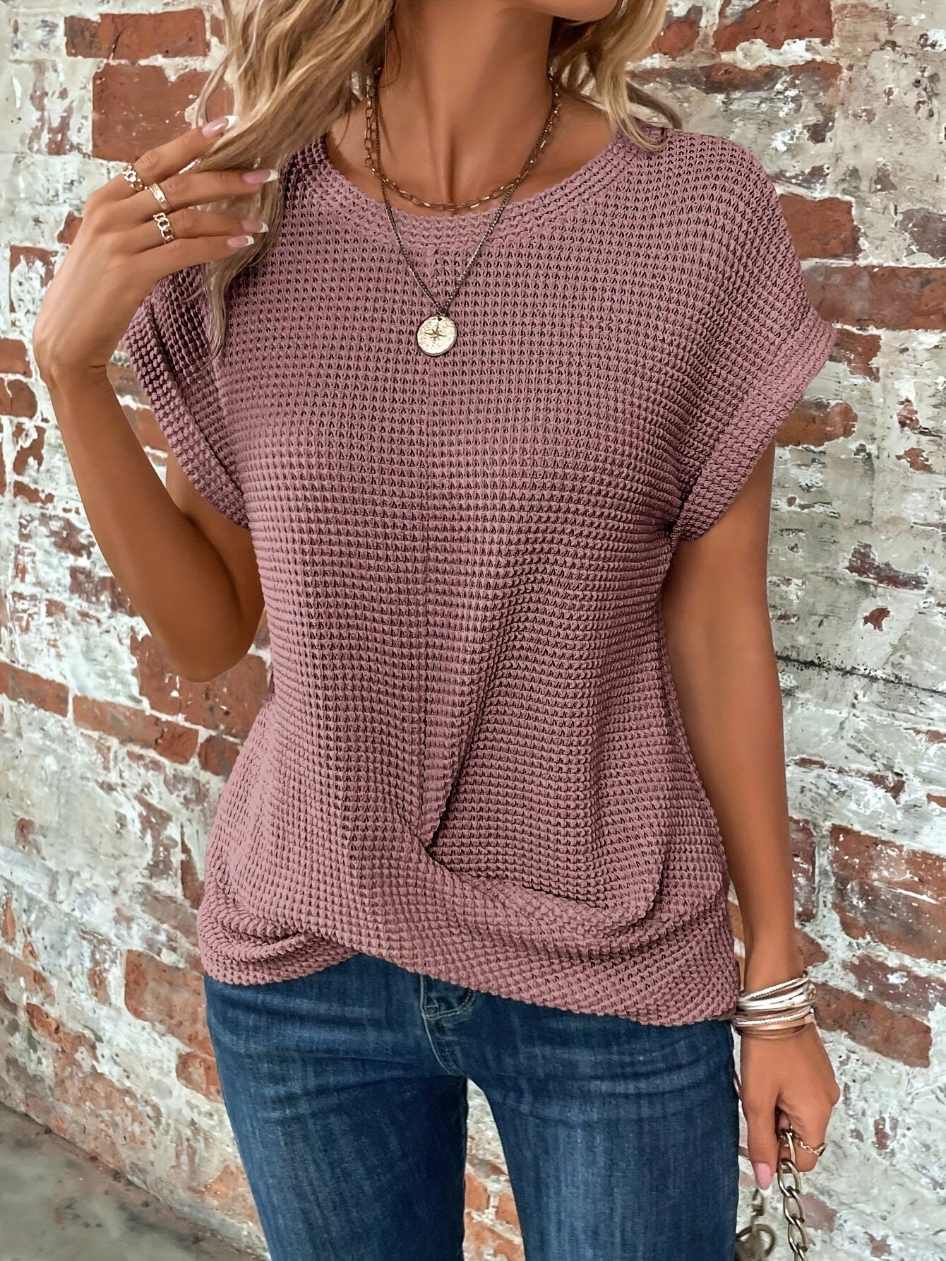 Genießen Sie die Weichheit des strukturierten Waffelstrickstoffs, der sich angenehm auf der Haut anfühlt und Ihnen den ganzen Tag über Wohlgefühl bietet. Der lockere Schnitt und die kurzen Ärmel verleihen dem T-Shirt eine moderne und bequeme Silhouette.
